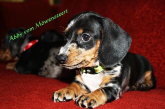 Unsere Abby heißt eigentlich Abigail vom Möwensteert FCI und ist unsere erste "Eigenproduktion". Wie man ihrem Namen schon ansehen kann, stammt sie aus unserem A-Wurf vom 07.04.2013.